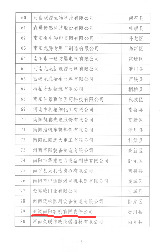 為深入實(shí)施創(chuàng)新驅(qū)動(dòng)發(fā)展和“兩輪兩翼”發(fā)展戰(zhàn)略,增強(qiáng)全市企業(yè)自主創(chuàng)新能力和核心競(jìng)爭(zhēng)力,引領(lǐng)促進(jìn)企業(yè)成為技術(shù)創(chuàng)新主體,按照《南陽市科技創(chuàng)新百強(qiáng)企業(yè)考核評(píng)定辦法》要求,亞澳農(nóng)機(jī)等6家企業(yè)榮獲此榮譽(yù)。