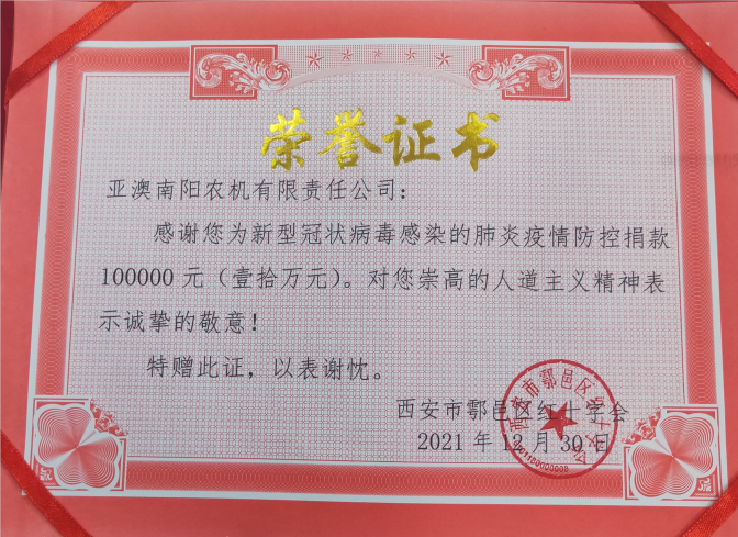 十二月份,一場突如其來的疫情打亂了西安人平靜的生活,面對日趨嚴峻的疫情態(tài)勢,亞澳農機作為一家有社會責任感的企業(yè)積極奉獻自己力量,亞澳農機南陽公司為鄠邑區(qū)紅十字會捐款100000元,亞澳農機總公司為鄠邑區(qū)甘亭街道東韓村捐款40000元,亞澳農機與社會各界人士并肩作戰(zhàn),為疫情防控工作貢獻自己的一份薄力。